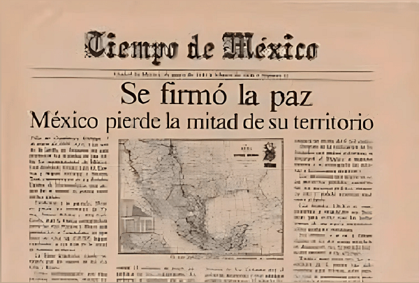 1848: Se firma el Tratado de Guadalupe Hidalgo entre México y los Estados Unidos. El Gobierno de México, en el marco de la Guerra de intervención estadounidense, cede a Estados Unidos más de la mitad de su territorio: la totalidad de lo que hoy son los estados de California, Arizona, Nevada y Utah; así como parte de Colorado, Nuevo México y Wyoming; se establece el Río Bravo del Norte como la línea divisoria entre Texas y México. Estados Unidos sólo pagaría 15 millones de dólares como compensación.