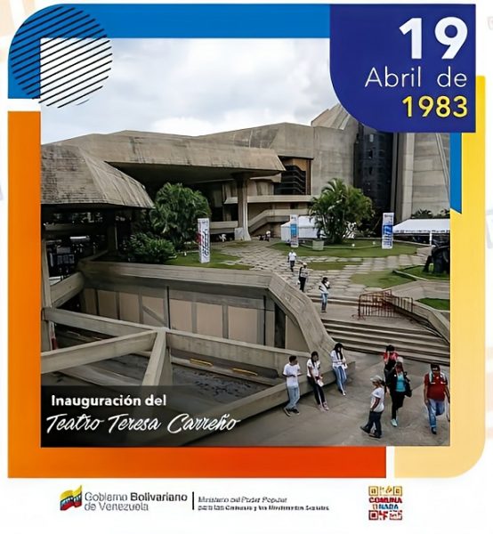 1983: Se inaugura el Teatro Teresa Carreño. La ceremonia de inauguración contó con un concierto de la Orquesta Sinfónica de Venezuela.Con capacidad para 2.900 personas, es el mayor complejo cultural de Venezuela y el segundo de América del Sur, y cuenta con dos grandes salas principales, salas de ensayo para músicos y cuerpos de ballet, y una sala de exposiciones sobre la vida de Teresa Carreño.