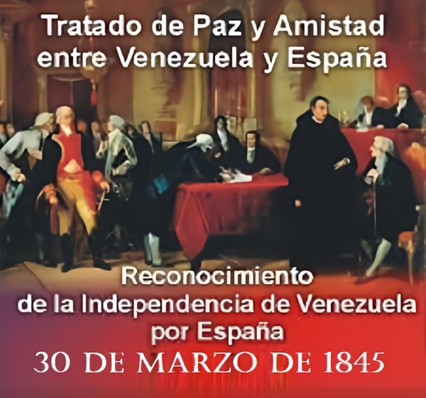 1845: España y Venezuela firman un Tratado de Paz y Amistad, en el que se reconoce la independencia venezolana. Los dignatarios fueron Fermín Toro (a nombre del presidente Carlos Soublette) y Francisco Martínez de la Rosa (a nombre de la reina Isabel II).