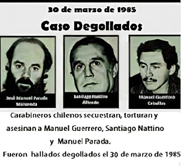 1985: En Chile, la dictadura de Augusto Pinochet tortura y degüella a tres profesores comunistas, Manuel Guerrero Ceballos, Santiago Nattino y José Manuel Parada (Caso Degollados).