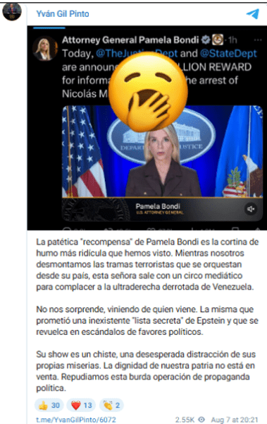 La patética «recompensa» de Pamela Bondi es la cortina de humo más ridícula que hemos visto. Mientras nosotros desmontamos las tramas terroristas que se orquestan desde Estados Unidos, esta señora sale con un circo mediático para complacer a la ultraderecha derrotada de Venezuela, cuestionó el ministro del Poder Popular para las Relaciones Exteriores, Yván Gil, tras las declaraciones de la funcionaria de EE.UU. en la que anunció el aumento de una recompensa contra el presidente de la República Bolivariana de Venezuela, Nicolás Maduro.
